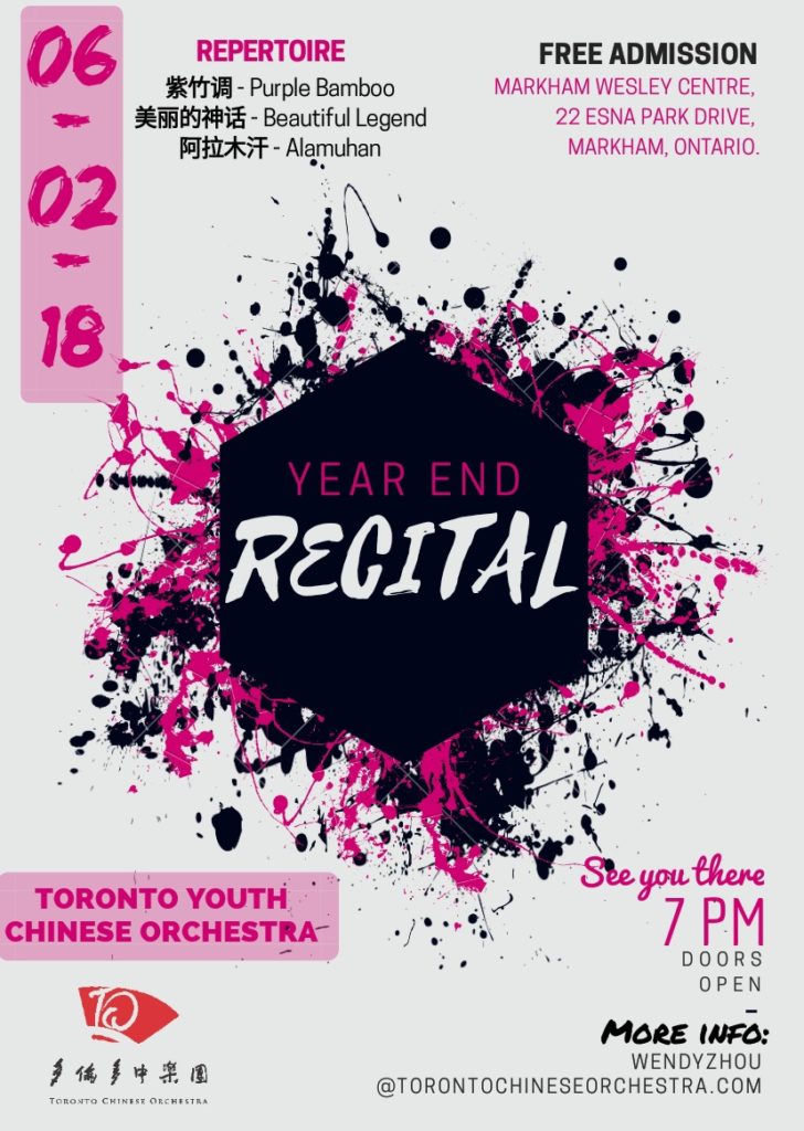2018-06-02 Toronto Youth Chinese Orchestra Year End Recital Post published:2018/05/10 Post category:Performances 表演 When: Saturday, June 2, 2018, 7 PM Where: Markham Wesley Centre, 22 Esna Park Drive, Markham Admission: Free More info: WendyZhou@TorontoChineseOrchestra.com You Might Also Like 2014-10-05 Amely Zhou’s Inaugural Erhu Concert 周嘉丽二胡独奏音乐会 2014/09/20 2016-07-03 Virtuosos Concert: Felix W.T. Yeung, Liuqin 楊瑋庭, 柳琴 2016/06/12 2011 Chinese New Year at Chinese Cultural Centre 2011/02/05